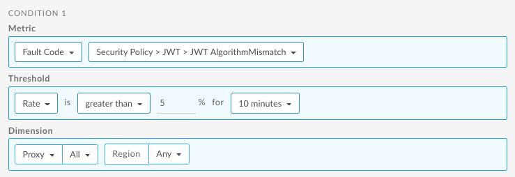 L'exemple suivant illustre comment configurer, à l'aide de l'interface utilisateur, une alerte déclenchée lorsque le nombre de codes d'erreur JWT AlgorithmMismatch pour la règle VerifyJWT est supérieur à 5 pendant 10 minutes pour toutes les API.