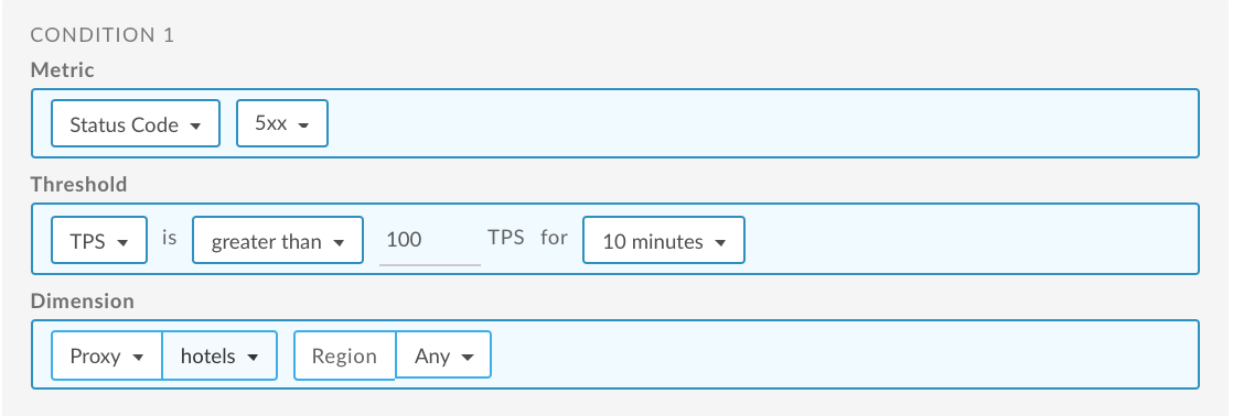 Berikut adalah contoh cara menyiapkan pemberitahuan menggunakan UI yang dipicu saat transaksi per detik (TPS) kode status 5xx untuk proxy API hotel melebihi 100 selama 10 menit untuk wilayah mana pun. Untuk informasi selengkapnya, lihat Menambahkan pemberitahuan dan notifikasi.