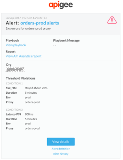 Par exemple, vous pouvez déclencher une alerte et envoyer une notification à l'équipe en charge des opérations lorsque le taux d'erreurs 5xx dépasse 23 % sur une période de 5 minutes sur le proxy API "orders-prod" déployé dans votre environnement de production.