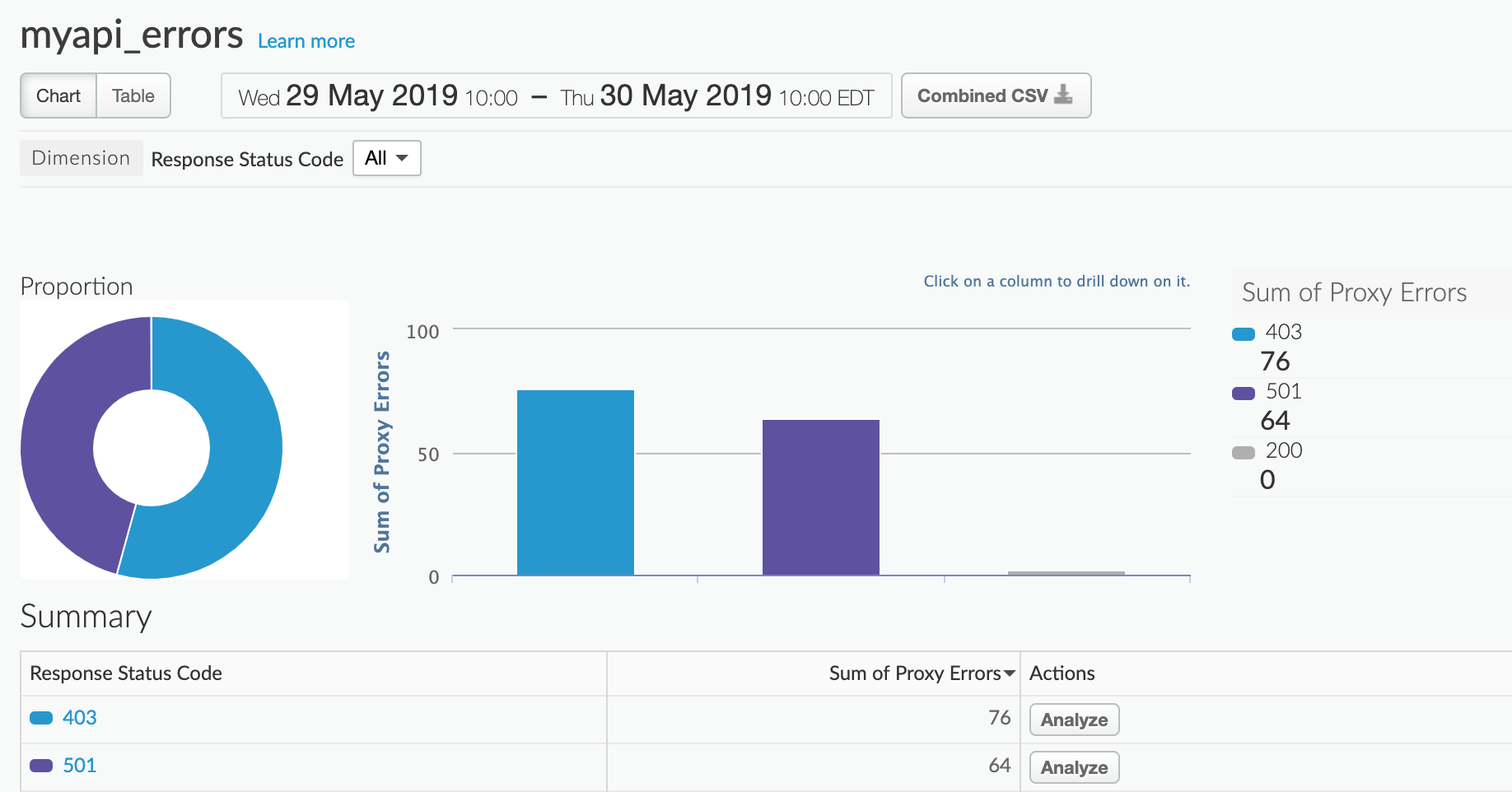 Filter dasbor Investigate menurut proxy myapi, lalu lihat Status Code di diagram atas. Perhatikan bahwa Anda mendapatkan error 403 dan 501:
