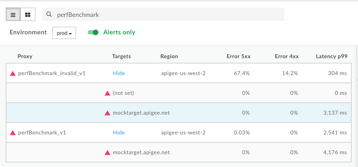 Hinweis: Wenn der Filter Nur Benachrichtigungen ausgewählt ist, werden nur die API-Proxys oder Zieldienste, die über Benachrichtigungen verfügen, in den Suchergebnissen aufgeführt.