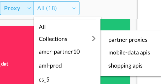 - 您可以從下拉式清單中選取元件,或雙擊方塊進一步下鑽,篩選顯示內容。在「Proxy」和「Target」下拉式選單中,您可以使用集合進行篩選。例如: