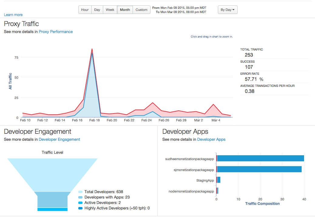 El panel de Apigee Edge es lo primero que ves cuando accedes a la IU clásica de Edge. Te brinda una vista general rápida de tu programa de API, incluidos los patrones de tráfico de API, la participación de los desarrolladores y las apps para desarrolladores. Además, puedes profundizar en cada gráfico para obtener una vista más detallada.
