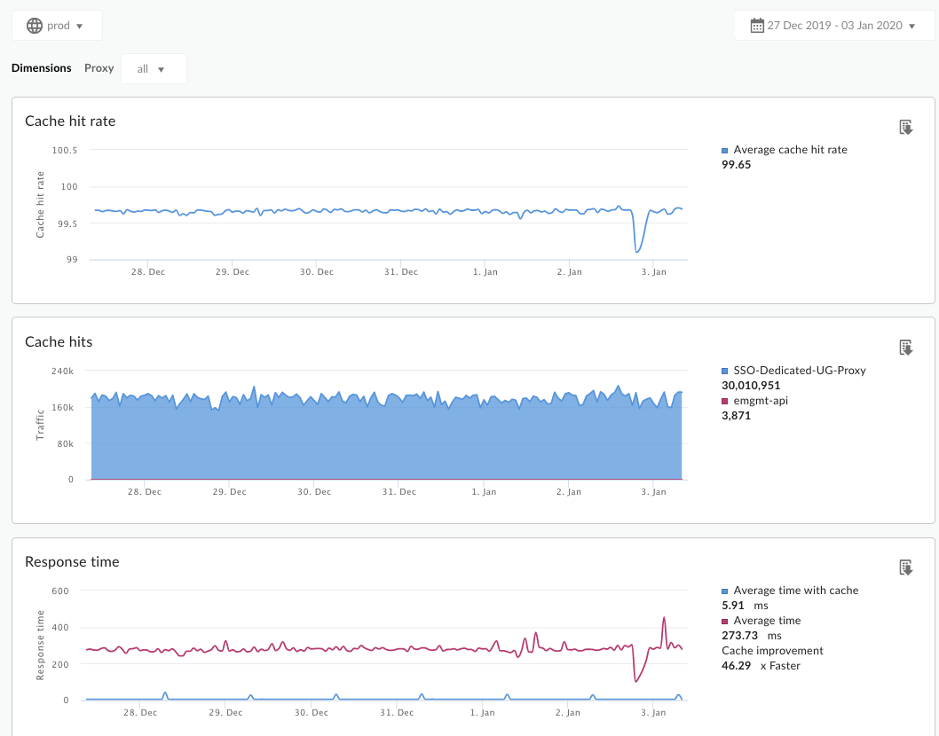 Le tableau de bord des performances du cache vous permet de rapidement consulter la valeur de votre cache Apigee Edge. Le tableau de bord vous aide à visualiser les avantages du cache en termes de latence réduite et de réduction de la charge des serveurs backend.