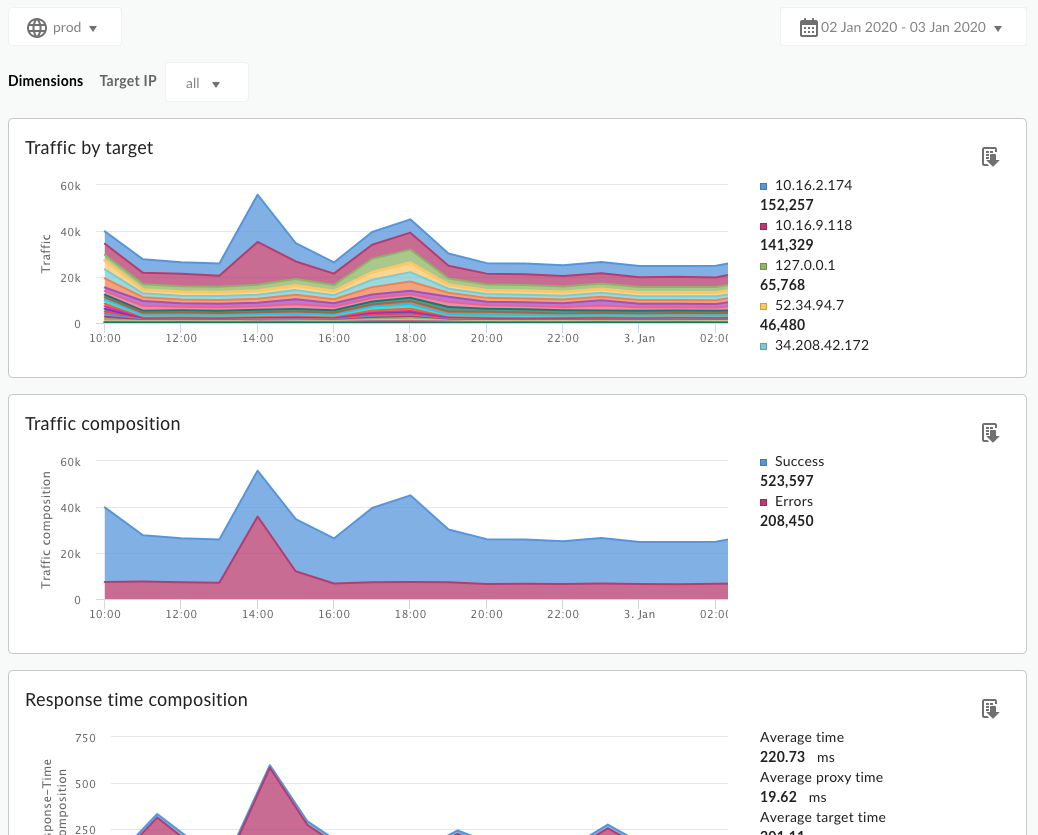 You can view metrics for all proxies or drill into specific proxies using the Target IP dimension dropdown menu at the top of the dashboard.