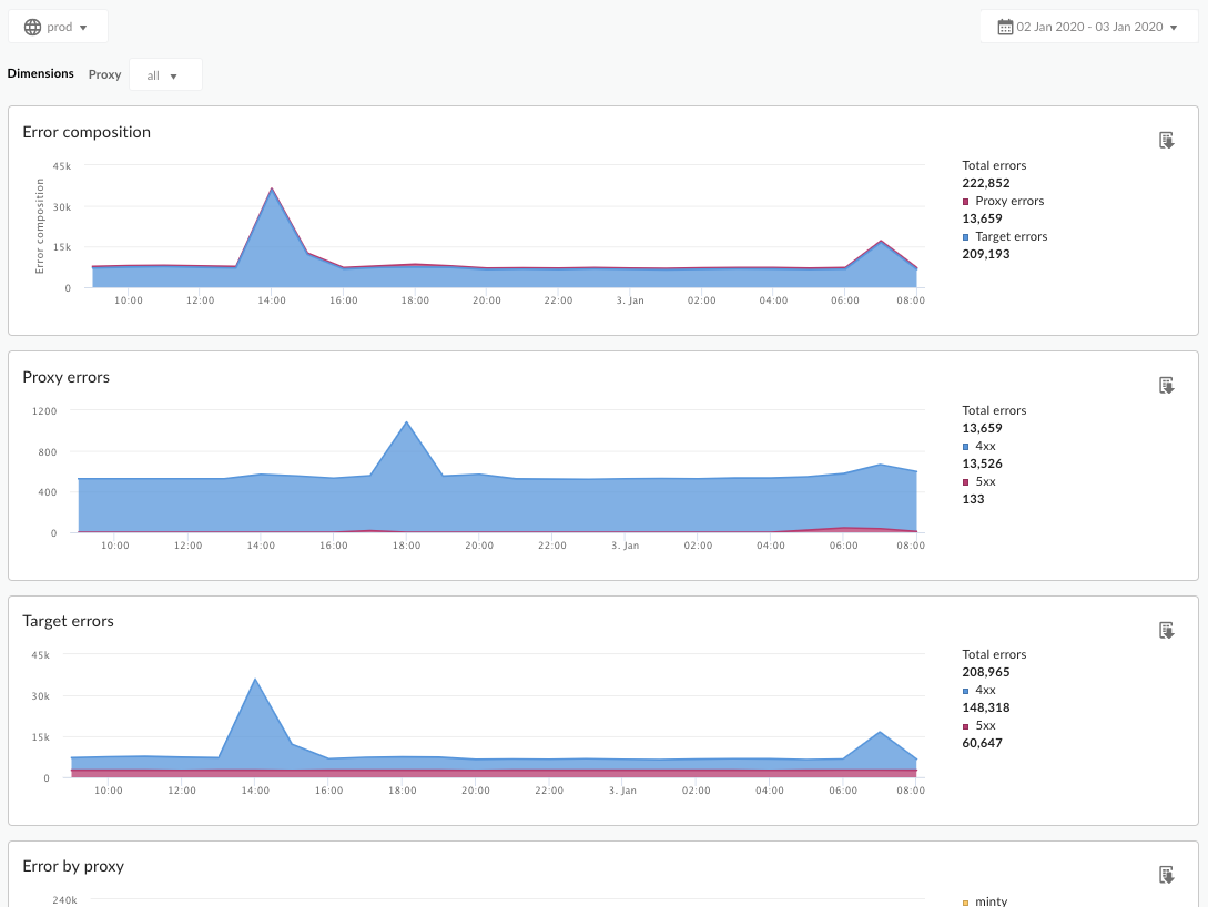 | Total de erros de proxy | O número total de erros de proxy vistos em uma organização da Apigee Edge no período especificado. Os erros de proxy são medidos entre o momento em que uma solicitação inteira é recebida pelo Apigee Edge de um cliente e o momento em que a solicitação é enviada ao destino de back-end. |