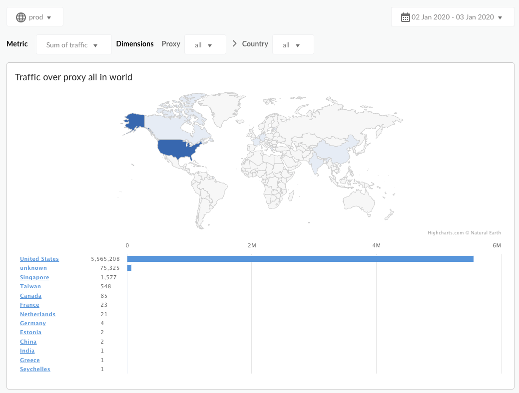 - Tendencias de crecimiento de API: Usa la métrica de tráfico para ver de dónde proviene tu tráfico. Si usas períodos diferentes, puedes ver qué países generan la mayor cantidad de tráfico en cada momento. También puedes registrar las tasas de tráfico durante diferentes períodos para ver las tendencias de crecimiento.