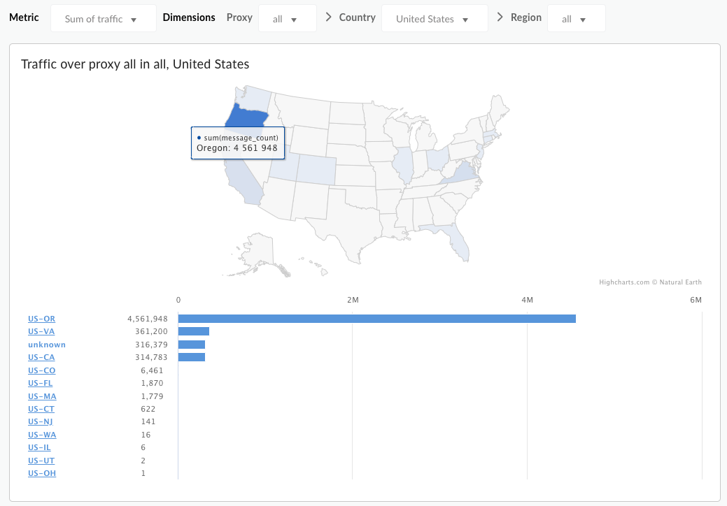 국가 목록에서 항목을 선택하여 특정 국가, 주, 도시(관심 있는 국가의 특정 지역에 따라 다름)를 드릴다운합니다. 측정항목이 기록되는 모든 국가가 이 메뉴에 표시됩니다. 예를 들어 미국 데이터를 보고 주를 선택한 다음 트래픽이 생성되는 도시 목록을 볼 수 있습니다. 도시 드릴다운은 현재 미국과 캐나다의 경우만 사용할 수 있습니다.