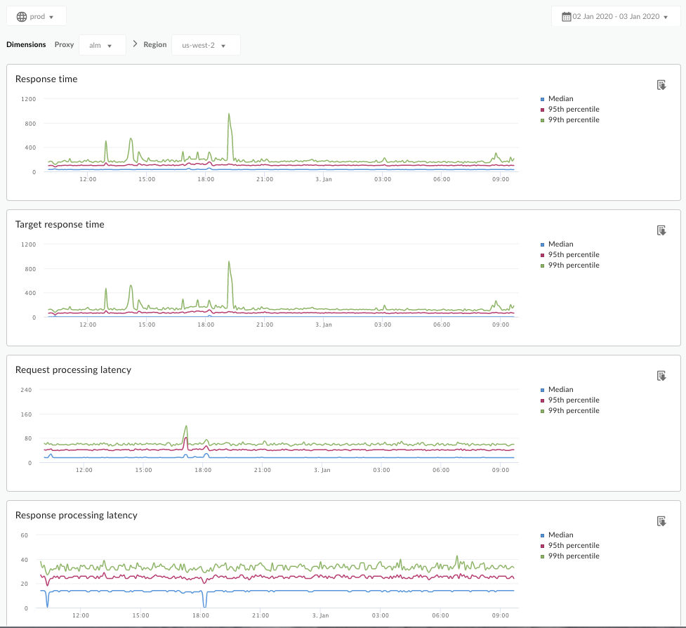 延迟时间分析信息中心可以提醒您 API 代理可能遇到的任何延迟问题。它将在一分钟的窗口中显示延迟时间的测量值,并突出显示中位数、第 95 个百分位和第 99 个百分位值。