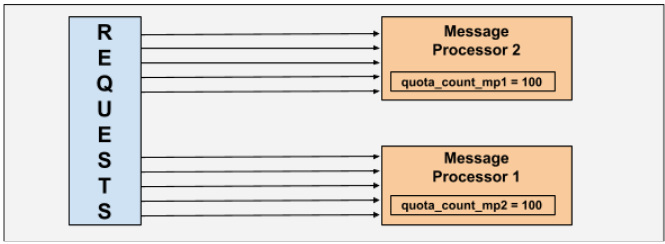 quota_count_mp1とquota_count_mp2を保持します。 - このため、それぞれの Message Processor が API リクエストを 100 個ずつ許可してしまいます。つまり、実際には 100 個のリクエストではなく、合計 200 個のリクエストが処理されることになります。