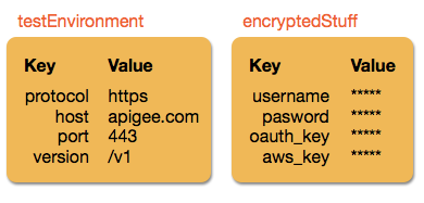 • 관리 API: 관리 목적으로 환경 키-값 맵 만들기 및 수정을 사용하여 KVM과 키/값을 가져올 수 있습니다. 예를 들어 JSON 정의를 가져와 저장하여 KVM을 백업하려면 관리 API를 사용합니다. 하지만 암호화된 값은 API 응답에 ***** 로 표시됩니다.