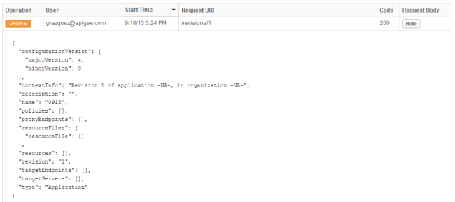 Apigee Edge propose une fonctionnalité "Historique" qui peut être utile pour résoudre les problèmes et gérer l'utilisation des API. La fonctionnalité d'historique vous permet d'afficher les opérations (créer, mettre à jour, lire, supprimer, déployer, annuler le déploiement) effectuées sur vos API et produits d'API au fil du temps. Vous pouvez voir qui a effectué chaque opération, quand elle a été effectuée, l'URI de la requête et le code de réponse. Pour les opérations de mise à jour, vous pouvez également afficher le corps de la requête transmise dans l'appel d'API.