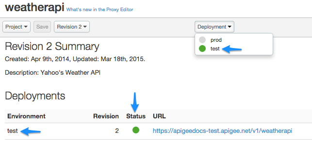 Wie Sie einen Proxy bereitstellen, hängt davon ab, wo Sie ihn entwickeln. Wenn Sie in der Benutzeroberfläche arbeiten, können Sie einen Proxy mit nur wenigen Mausklicks bereitstellen. Ein neuer Proxy wird beim Erstellen automatisch bereitgestellt. Sie müssen nichts weiter tun. Das Verfahren zum erneuten Bereitstellen eines vorhandenen Proxys ist fast genauso einfach. Wählen Sie einfach die Bereitstellungsumgebung aus, in der die Bereitstellung erfolgen soll. Die Verwaltungsoberfläche erledigt den Rest. Weitere Informationen finden Sie unter Proxys in der Benutzeroberfläche bereitstellen.