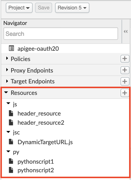 范围限定为 API 代理修订版本的资源列在导航视图中的资源部分。