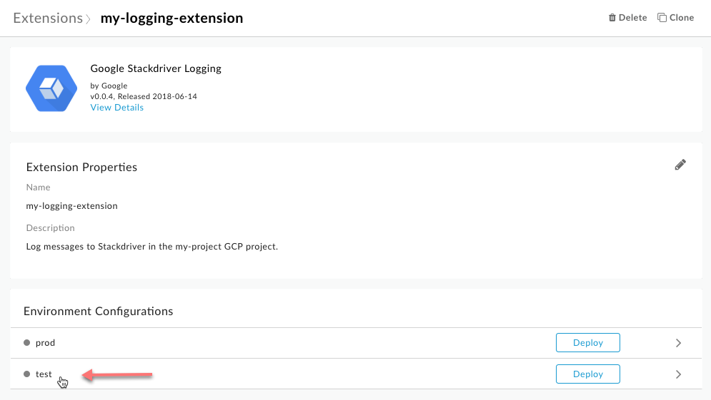 - Na página Extension > My-Extension-Name da extensão, clique em Deploy para implantar a extensão para uso em um proxy de API.