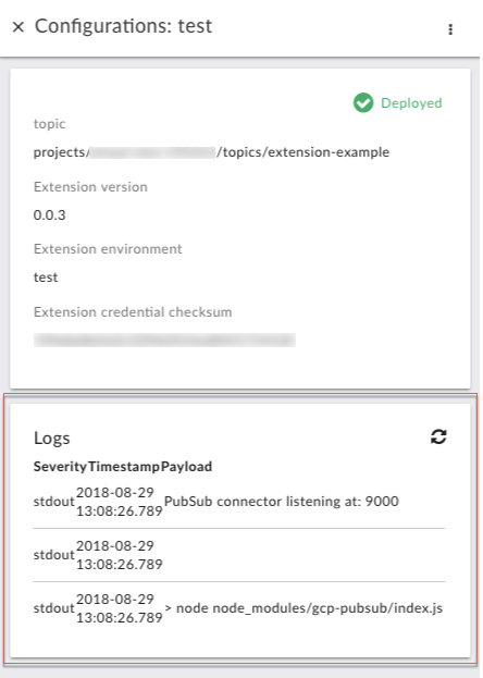 배포된 각 확장 프로그램의 로그를 볼 수 있습니다. 예를 들어 프로덕션 및 테스트 환경에 배포할 확장 프로그램을 구성한 경우 각각 자체 로그가 있습니다.