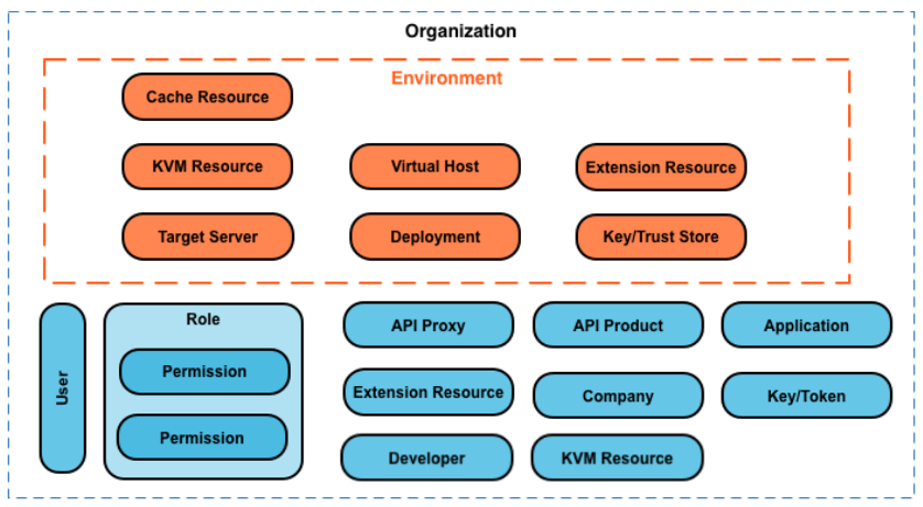 Organization provides scope for some Apigee capabilities. For example, key-value-map (KVM) data can be made available at the organization level, meaning that API Proxies deployed to any environment would get the same data from KVM. Some capabilities, such as caching, can be scoped to the organization, or to a specific environment within the organization. Apigee analytics data is partitioned by a combination of organization and environment.