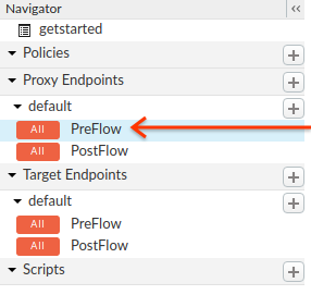 탐색기 창에서 프록시 엔드포인트 > 기본 > PreFlow를 클릭합니다.