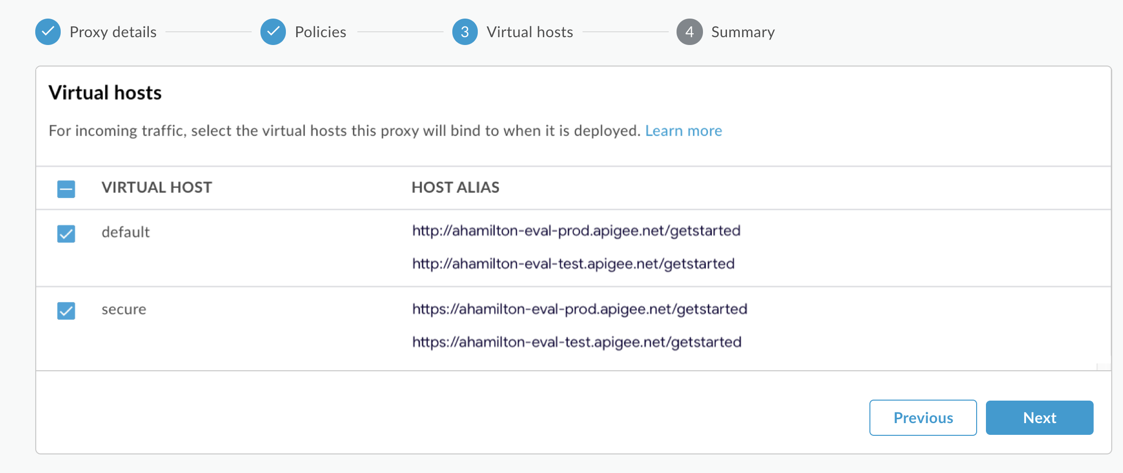 - Wählen Sie auf der Seite Virtual hosts die Optionen default und secure aus und klicken Sie auf Next.
