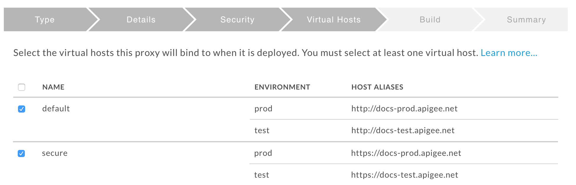 - Sur la page Virtual hosts (Hôtes virtuels), sélectionnez default (Par défaut) et secure (Sécurisé), puis cliquez sur Next (Suivant).