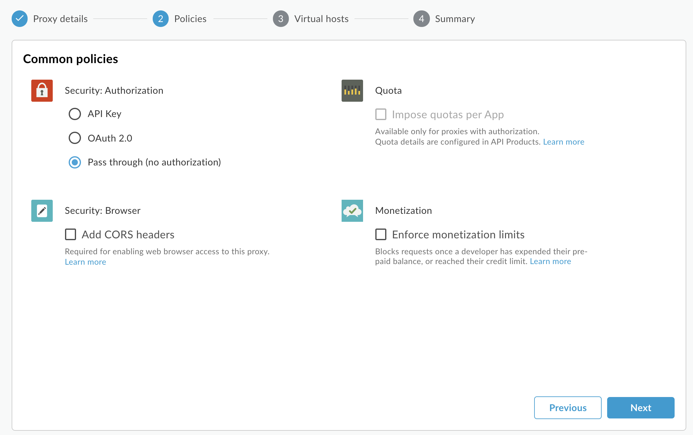 - Di halaman Kebijakan umum, pada bagian Keamanan: Otorisasi, pastikan Pass through (tanpa otorisasi) dipilih, lalu klik Berikutnya.