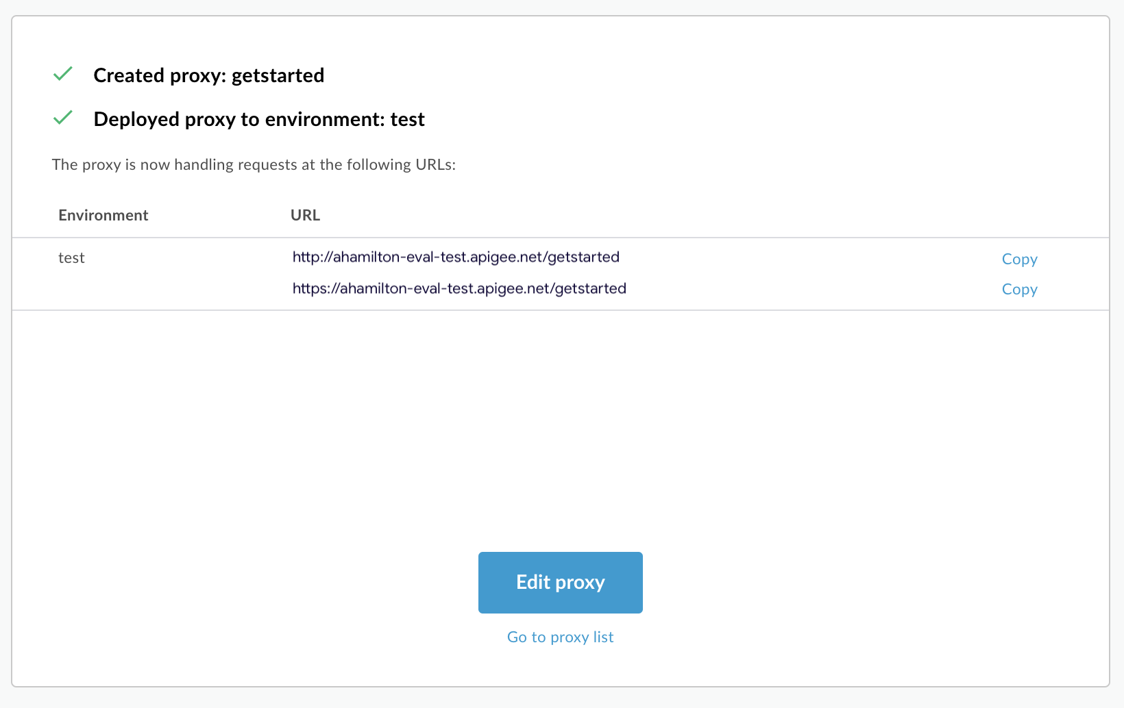 Apigee erstellt Ihren neuen API-Proxy und stellt ihn in Ihrer Testumgebung bereit: