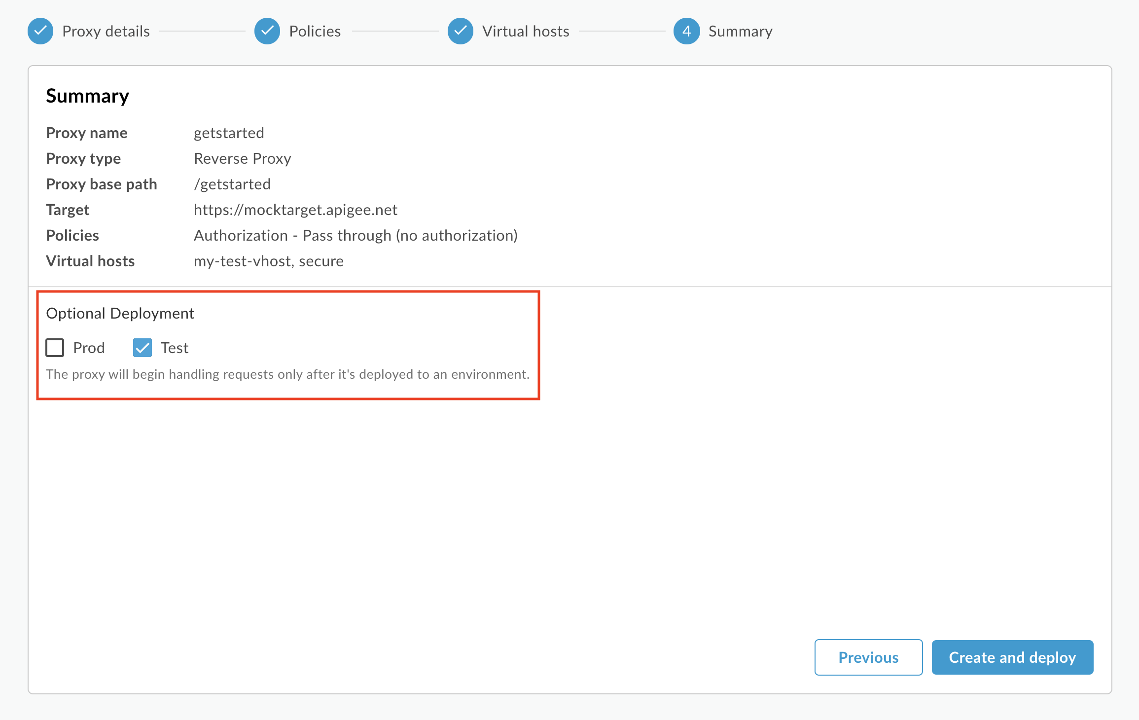 - Sur la page Summary (Résumé), assurez-vous que l'environnement de Test est sélectionné sous Optional Deployment (Déploiement facultatif) et cliquez sur Create and deploy (Créer et déployer) :
