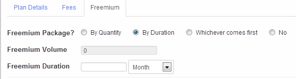 Duração do Freemium É o intervalo de tempo em que os desenvolvedores não são cobrados. Digite um número e selecione um período, por exemplo, 1 mês. Isso significa que os desenvolvedores não estão cobrado por um mês após a data de início do plano adquirido. Este campo é ativada apenas se você selecionar "Por duração" ou "O que vier primeiro" na versão "freemium" Pacote?" .