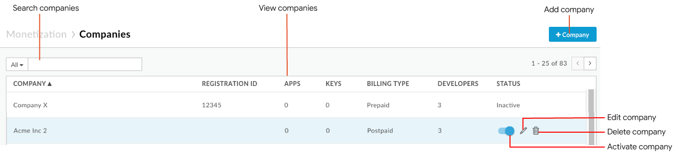- 회사 이름, 등록 ID, 등록된 앱 및 API 키 수, 결제 유형, 회사에 할당된 개발자 수, 상태를 비롯한 모든 회사의 요약 정보를 확인합니다.