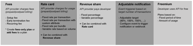 | Tarifas | Se le cobran tarifas al desarrollador de la app por usar el paquete de productos de la API y sus recursos. Crea un plan solo con tarifas o agrega tarifas a un plan de tarifas. Las tarifas pueden incluir lo siguiente:
