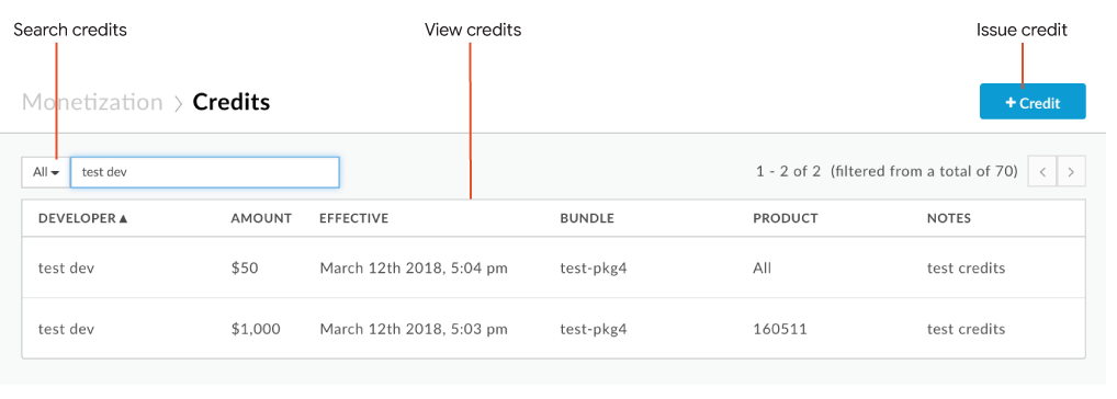• 查看所有抵免額的摘要資訊,包括收款人名稱、抵免額金額、抵免額生效日期和時間, 適用抵免額的 API 產品套裝組合和 API 產品,以及任何附加的附註