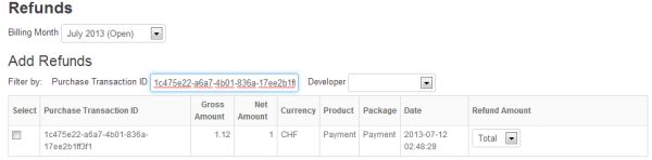{ "application" : { ... }, "product" : [ { ... { "customAtt1Name" : "user", "description" : "Payment", "displayName" : "Payment", "id" : "payment", "name" : "payment", "organization" : { ... }, "status" : "CREATED", "transactionSuccessCriteria" : "Status=='200 OK'" } ], ... }, "currency" : "USD", "developer" : { ... "legalName" : "DEV ONE", "name" : "Dev One", "organization" : { ... }, ... }, "endTime" : "2013-09-01 21:59:59", "environment" : "PROD", "euroExchangeRate" : 0.8123, "gbpExchangeRate" : 0.6910, "grossPrice" : 0.5, "id" : "61f7eb88-f8cc-4cda-afd8-4a61fba3dd33", "isRevOnGrossOrNet" : "NET", "isVirtualCurrency" : false, "notes" : "Refund for purchase transaction", "itemDesc" : "test application", "netPrice" : 0.4464, "orgRevenueShareAmount" : 0.1339, "parentId" : "abf50909-2492-4bf5-8704-ade05f4d43b3", "pkgId" : "myorg@@@payment", "pkgRatePlanProductName" : "Payment", ... }, "ratePlanLevel" : "STANDARD", "revenueShareAmount" : 0.3125, "startTime" : "2013-09-01 21:59:59", "status" : "SUCCESS", "tax" : 0.0536, "taxModel" : "UNDISCLOSED", "txProviderStatus" : "SUCCESS", "type" : "REFUND", "usdExchangeRate" : 1.0724, "utcEndTime" : "2013-09-01 21:59:59", "utcStartTime" : "2013-09-01 21:59:59" }