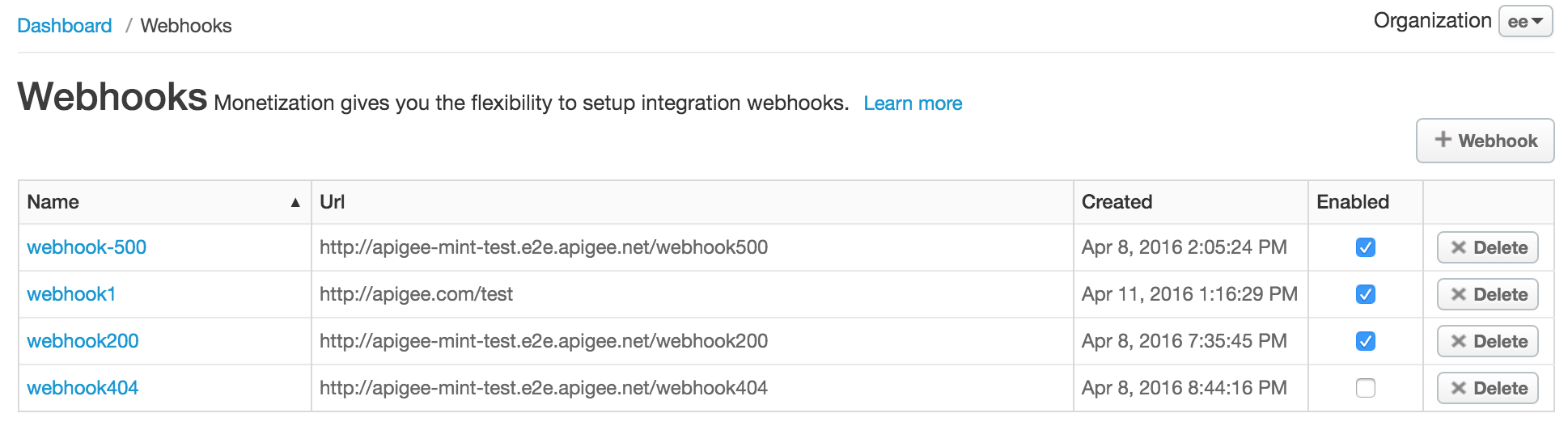 { "created": 1460385534555, "enabled": true, "id": "0a07eb1f-f485-4539-8beb-01be449699b3", "name": "webhook3", "orgId": "myorg", "postUrl": "http://mycompany.com/callbackhandler4", "updated": 1460385534555, "updatedBy": "joe@example.com" }