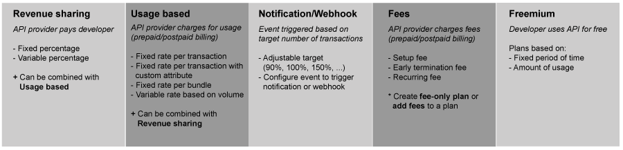 Configurez votre plan tarifaire pour utiliser un ou plusieurs des modèles de revenus ou types de plans tarifaires illustrés dans la figure suivante.