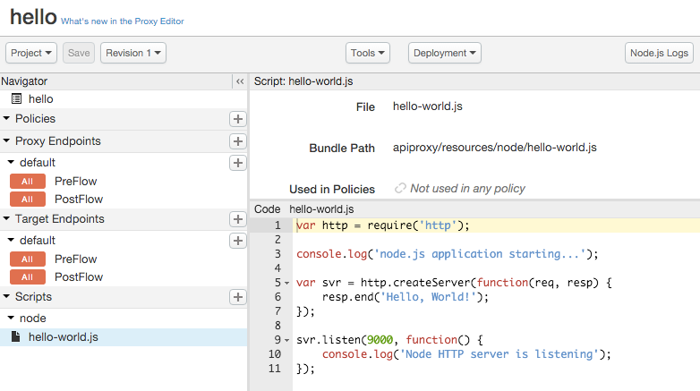 É provável que o primeiro aplicativo Node.js que você criou foi um servidor HTTP que responde solicitações com "Hello World!" A maneira mais simples de testar o Node.js no Apigee Edge é com algo muito semelhante. Com apenas alguns cliques do mouse, você terá um Node.js funcional com proxy Servidor HTTP em execução na borda. Depois disso, você pode usar o editor de código na IU para modificar a App Node.js, adicionar outros arquivos Node.js, incluir políticas e assim por diante.