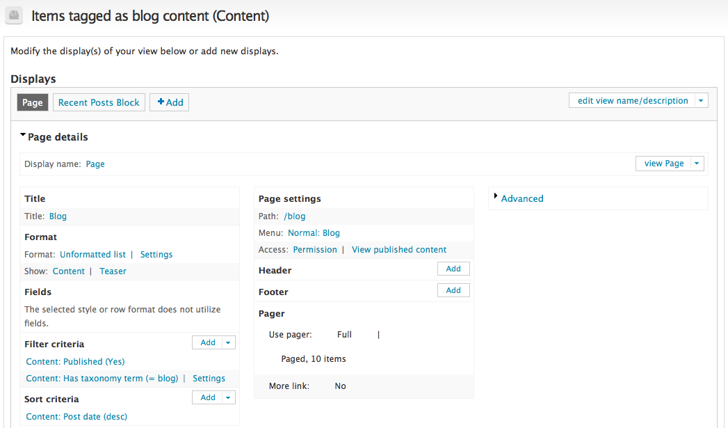 - [Edit]([Items tagged as blog content view(Content)] ビューの行にあります)を選択します。これにより、ビューを構成するために使用できる次のページが表示されます。