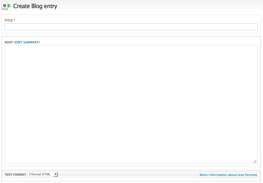 新しいブログエントリを作成すると、Blog モジュールにより、投稿者 ID、作成の日付、コンテンツ タイプなど、コンテンツに関する基本的な情報が記録されます。