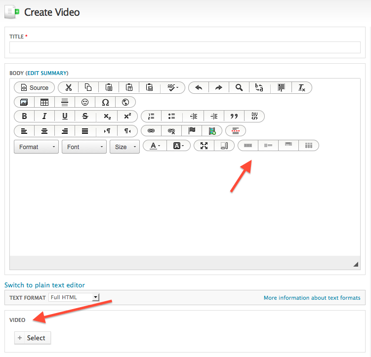 エディタ下部の領域では、関連付けるメディアを追加できます。たとえば、動画コンテンツ タイプについての上の図では、動画をブログエントリに追加できます。