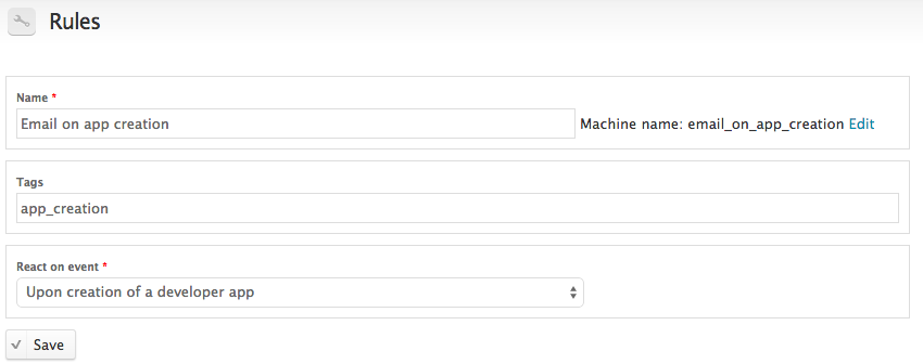 Drupal Rules モジュールでは、ポータル上のイベントに応答して自動的に発生するアクションを指定するルールを定義できます。たとえば、新しいすべてのデベロッパー アカウント(イベント)にデフォルト アプリを自動的に追加する(アクション)ルールを作成できます。また、ログイン(イベント)時にユーザーを特定のページにリダイレクトする(アクション)ルールを作成することもできます。ユーザー アカウントの追加と管理では、これらの 2 つのルールを定義する方法について説明しています。