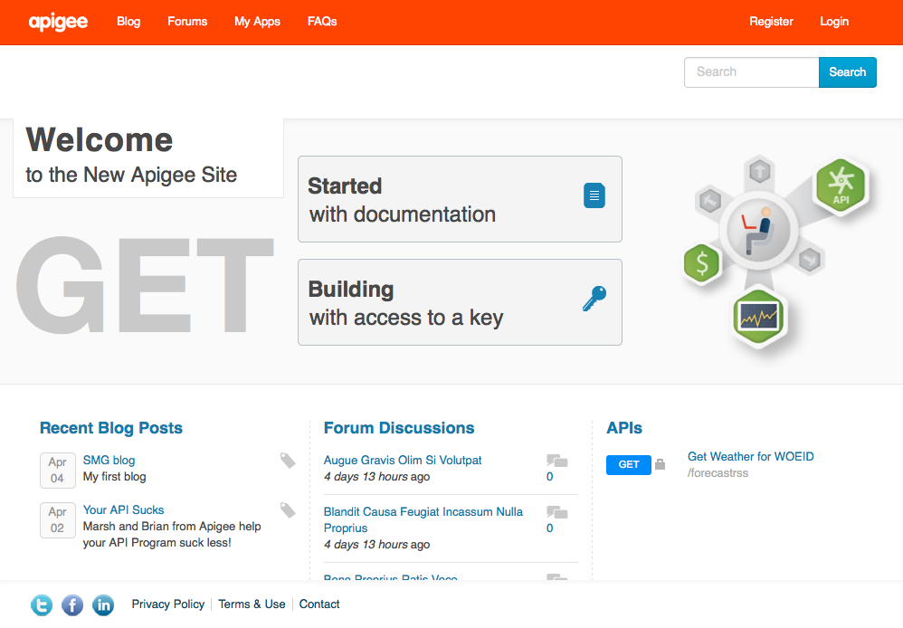 ポータルを公開して使用する準備ができたら、デベロッパーをポータルに送信し始めます。デベロッパーの登録時に、デベロッパーは(Drupal 管理者ではなく)単に「認証済みユーザー」として追加されます。デベロッパーのユーザー情報が Drupal および enterprise.apigee.com 環境に自動的に追加され、後者で「デベロッパー」として登録されます。デベロッパー ポータルでは、アプリに使用する API プロダクトをデベロッパーが選択します。デベロッパーがデベロッパー ポータルでアプリを登録すると、enterprise.apigee.com サイトにもアプリが登録されます。デベロッパー ポータルと enterprise サイトが接続されます。