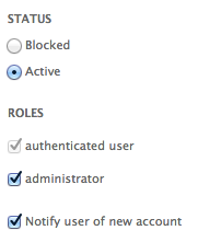 - [Active] と [administrator] を選択します。新しいポータルのリンクを記載した自動メールをユーザーに送信するには、[Notify user of new account] を選択します。