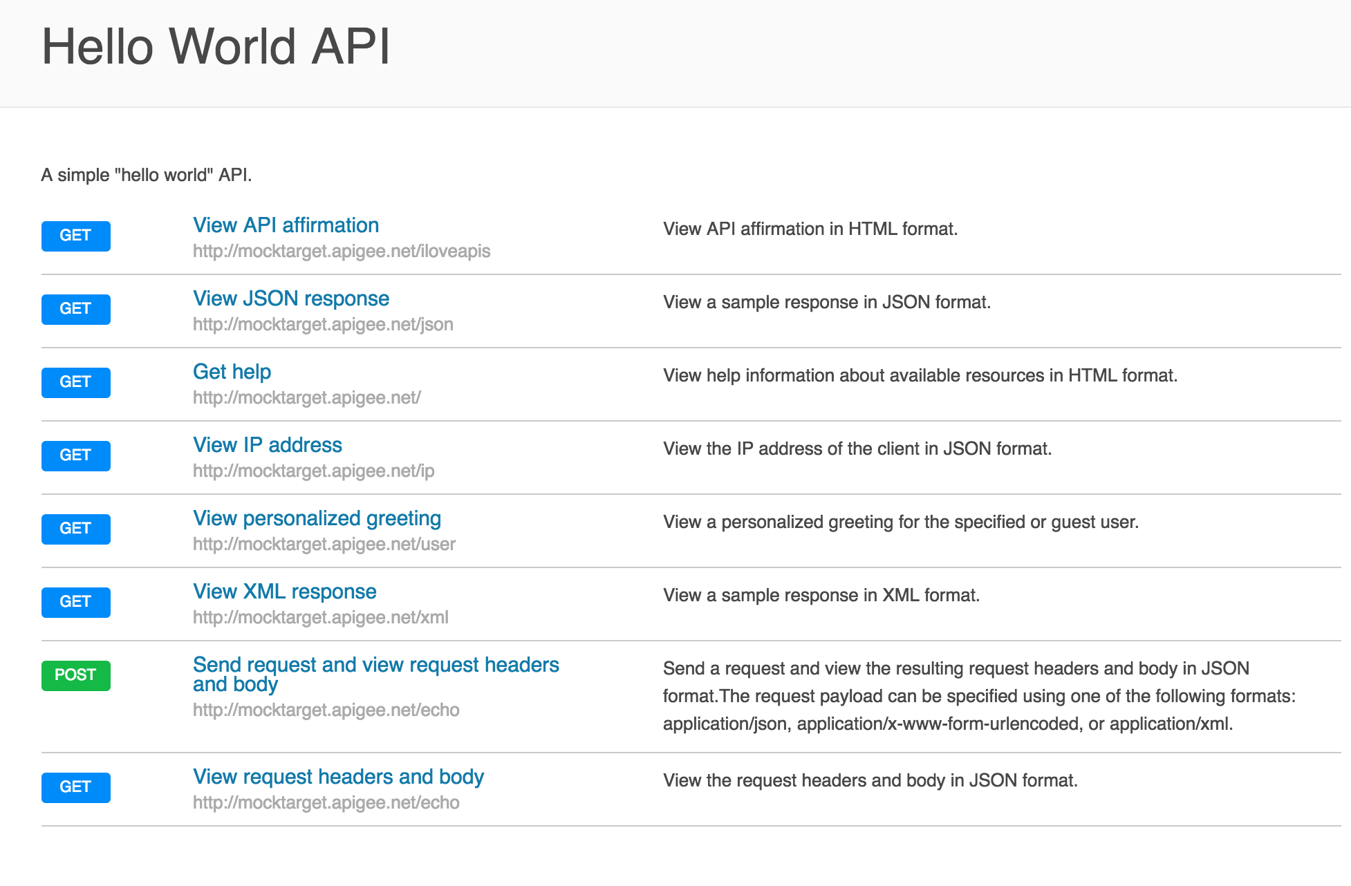 Hello World API は、疑似ターゲットの OpenAPI 仕様 mocktarget.yaml から作成されました。詳細については、https://github.com/apigee/api-platform-samples/tree/master/default-proxies/helloworld/openapi をご覧ください。