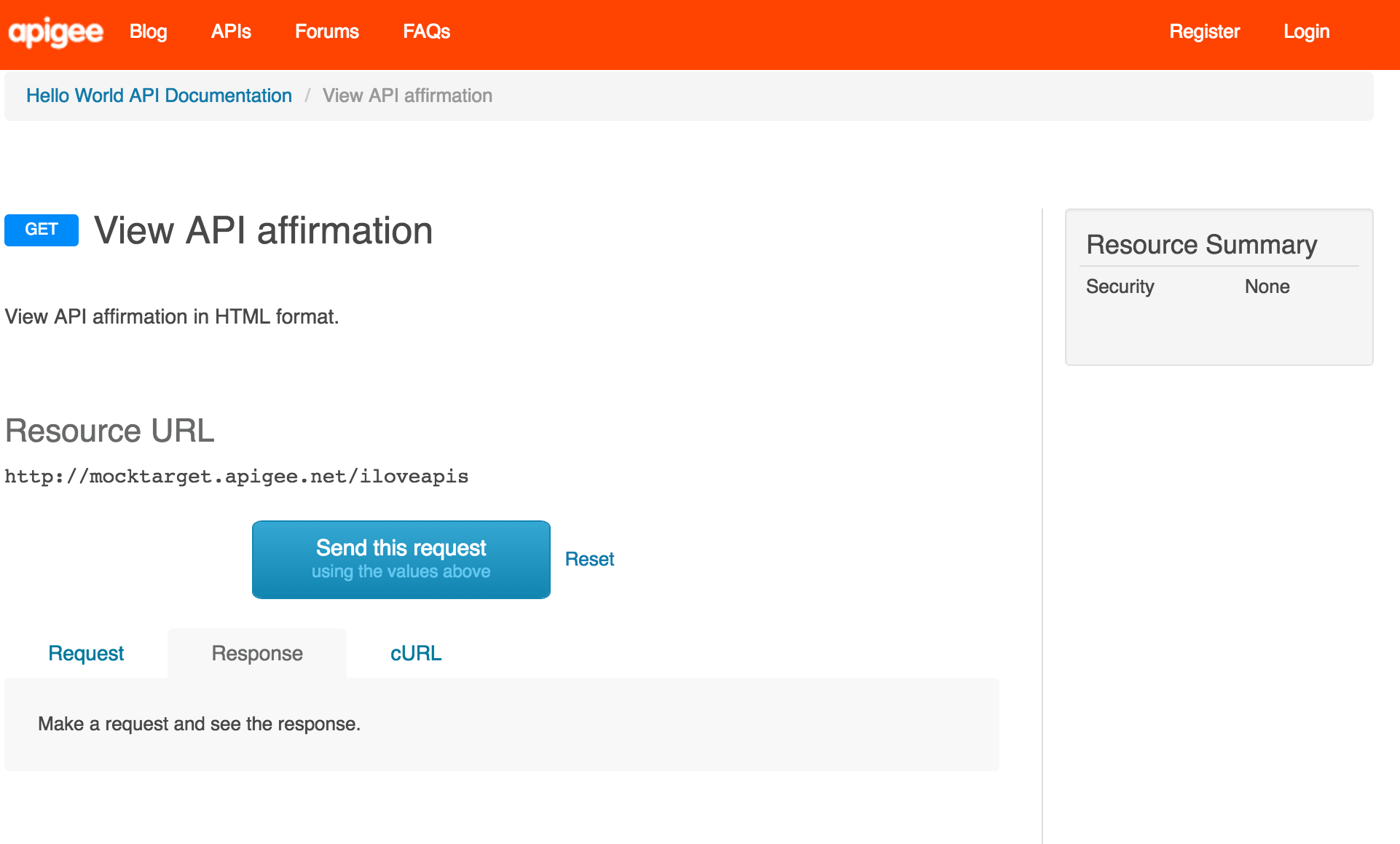 Hello World API は、疑似ターゲットの OpenAPI 仕様 mocktarget.yaml から作成されました。詳細については、https://github.com/apigee/api-platform-samples/tree/master/default-proxies/helloworld/openapi をご覧ください。