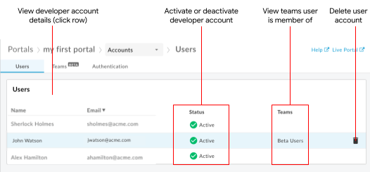 Administra los usuarios del portal como se describe en las siguientes secciones. Consulta también Crea una cuenta de usuario en el portal integrado.