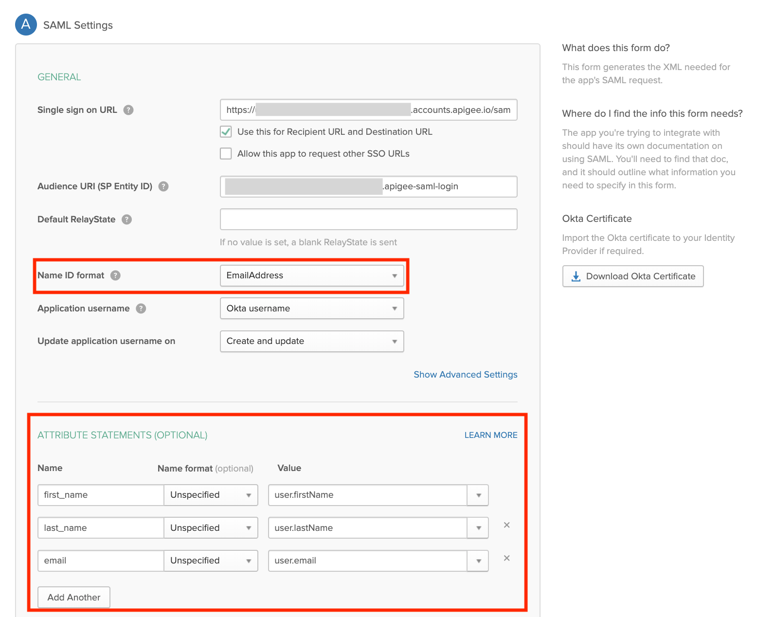 Veja a seguir como configurar atributos de usuário personalizados e o atributo NameID usando o Okta como seu provedor de identidade SAML de terceiros.
