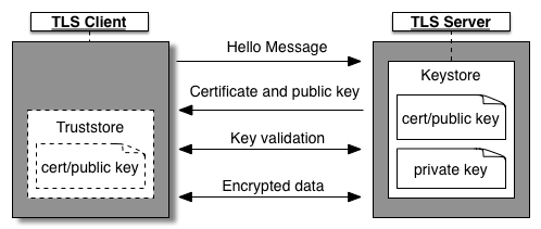 - Client und Server haben jeweils eigene Keystores. Der Schlüsselspeicher des Clients enthält sein Zertifikat und seinen privaten Schlüssel und der Schlüsselspeicher des Servers enthält sein Zertifikat und seinen privaten Schlüssel.