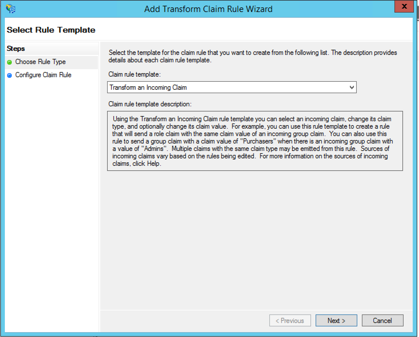 - 選取「Transform an Incoming Claim」做為「Claim rule template」,然後按一下「Next」: