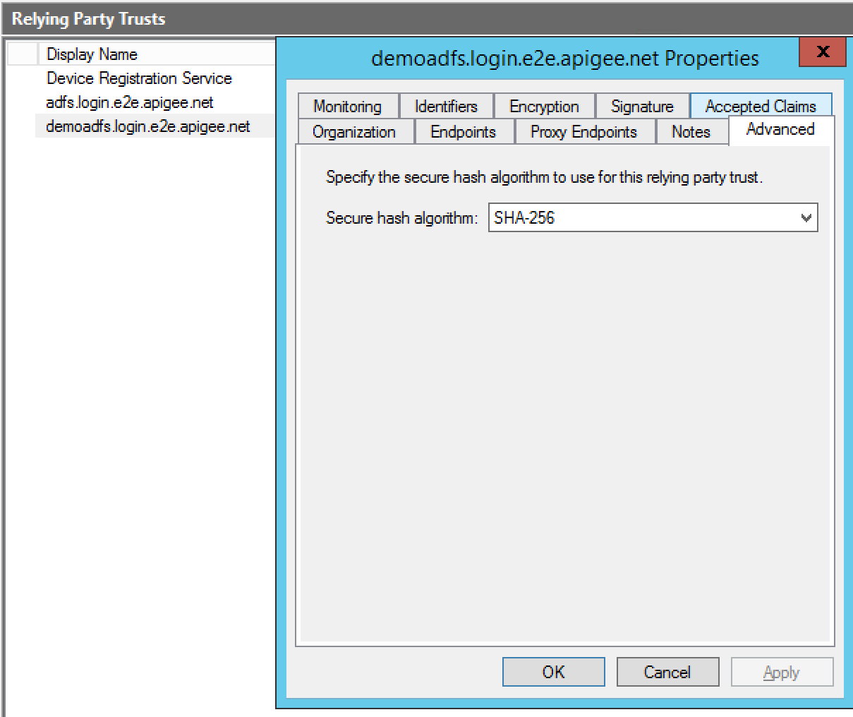 11. Navegue até a guia Avançado. Defina o algoritmo de hash seguro como SHA-256 e clique em Aplicar.