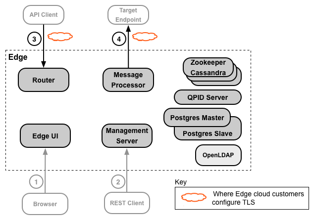 次の図は、Edge クラウドを使用している場合に TLS をどこで構成するかを示します。