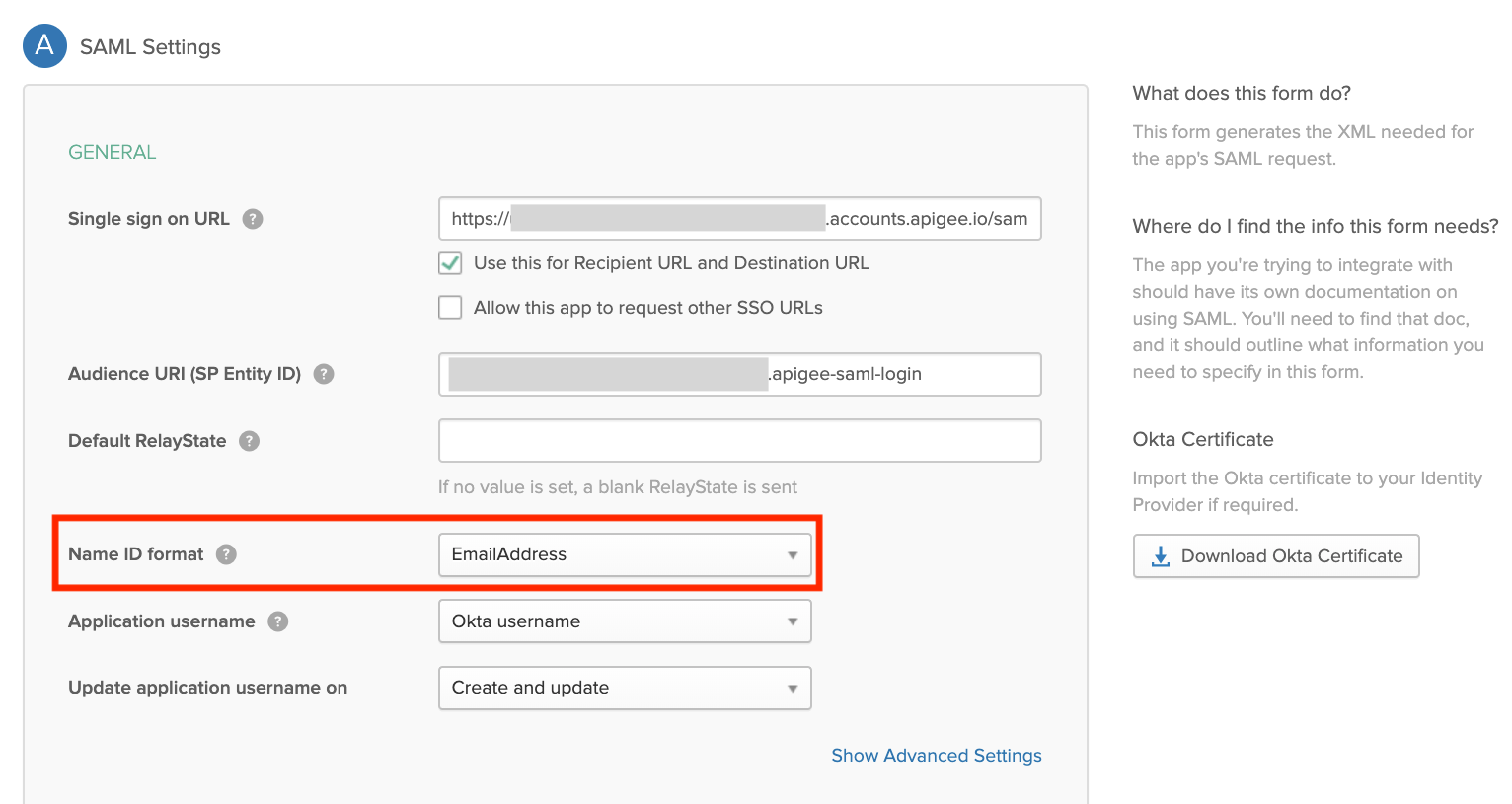 NameID属性がユーザーのメールアドレスにマッピングされていることを確認します。ユーザーのメールアドレスは、Edge デベロッパー アカウントの一意の識別子として機能します。次に Okta を使用した例を示します。ここでは、[Name ID format] フィールドでNameID属性を定義しています。